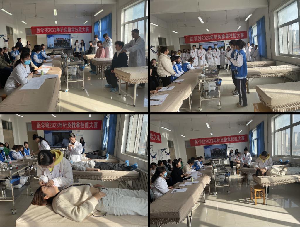 针灸推拿技能大赛为团体赛(3人一队),经过初赛、复赛,最终,共有10个团队(30名同学)进入决赛。大赛共包括三个赛项,分别是经络腧穴赛项、毫针刺法赛项和推拿手法赛项,每个赛项均有3名评委,评委评分后由记分员进行总分。经过2个多小时激烈比拼,最终,张炼枝、任林玲、何雅琪组获得团体一等奖,王雅琳、渠文丹、魏依诺组,肖环宇、闫永琪、唐家学组获得团体二等奖,张子瑶、杨刚、王昶森组,邓鸿、王炳帅、李阳组,刘婷婷、郭淼、陶欣羽组获得团体三等奖。