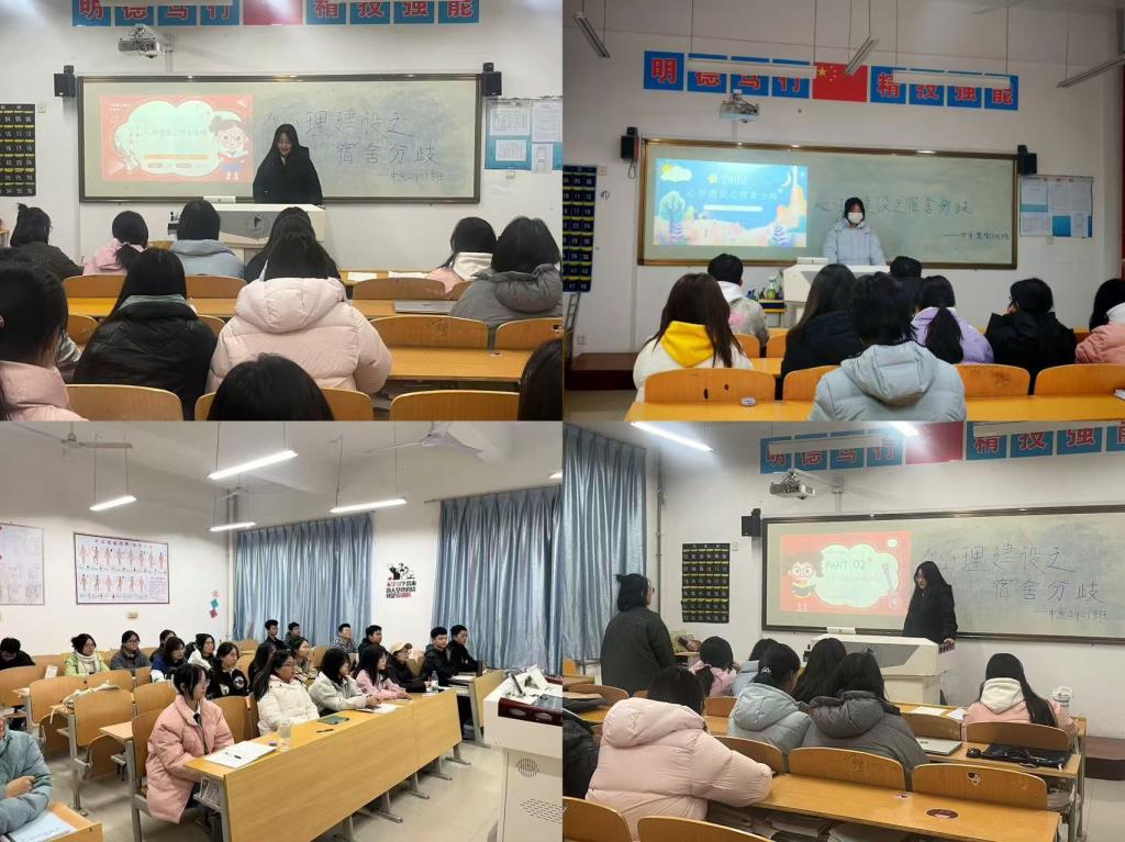 宿舍是老员工日常生活的重要场所,为有效化解宿舍矛盾、分歧等一系列问题的产生,2024年12月4日晚自习,best365官方网站登录入口心理部围绕如何进行有效的心理建设,在各班开展心理建设之“宿舍分歧”主题心理课。该课由各班心理委员主持讲解,分为分享经验、讲解分析、讨论等三个环节,全部同学参与课程学习。